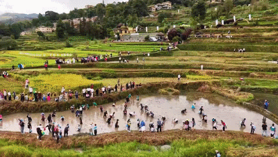 在云南省红河州,元阳哈尼小镇国庆假期举办了首届哈尼梯田泥泞挑战赛。“泥地寻宝”“梯田拔河”“稻田哺养”等技俩酷好酷好都备。300余名参赛选手们在梯田间奔波,体验别样的农耕乐趣。