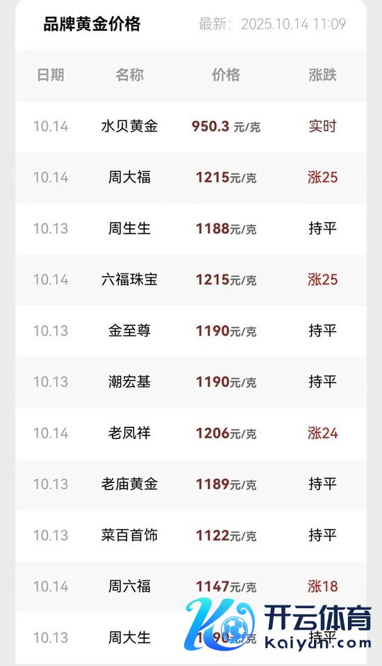 记者通过及时金价小轨范看到,死心10月14日11时09分,金饰价钱仍是冲破1200元/克。相较于前一日,不同品牌金饰价钱呈现不同幅度的飞腾,比如周大福相较于上一日飞腾了25元/克,价钱达到了1215元/克,水贝黄金的及时价钱也达到了950元/克的水平。